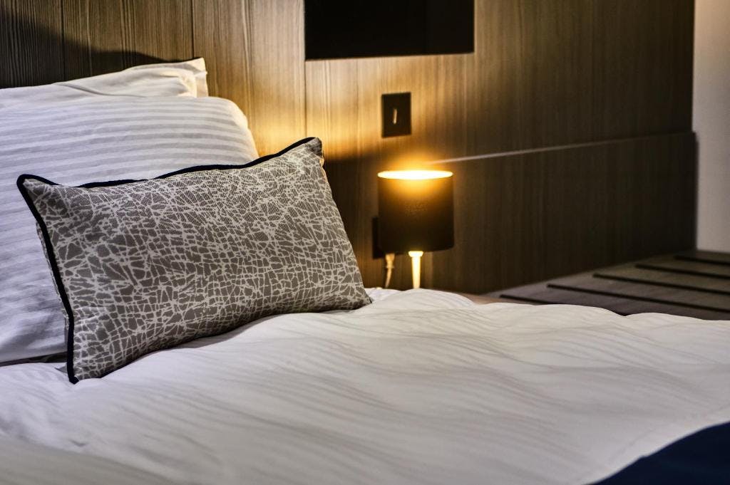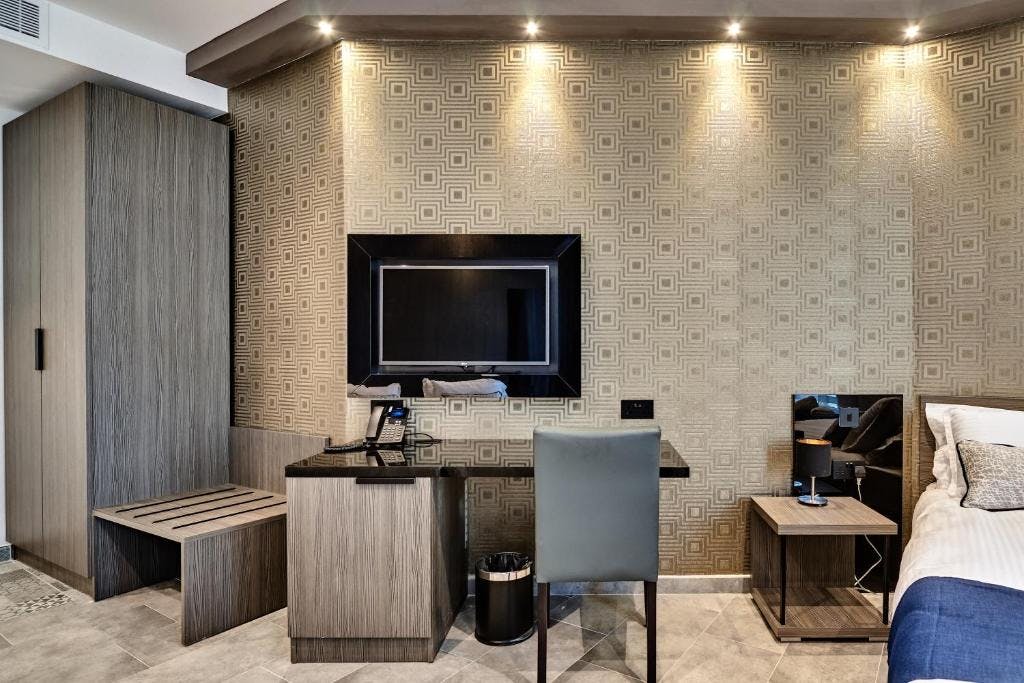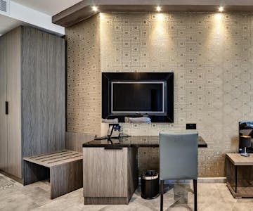 The Deluxe Rooms are designed as the standard accommodation option, ideal for couples or individuals. These rooms comfortably accommodate up to 2 persons and provide a cozy and inviting space for a relaxing stay. The modern decor enhances the ambiance, while the neutral color scheme of black, grey, and navy blue creates a stylish and soothing atmosphere.